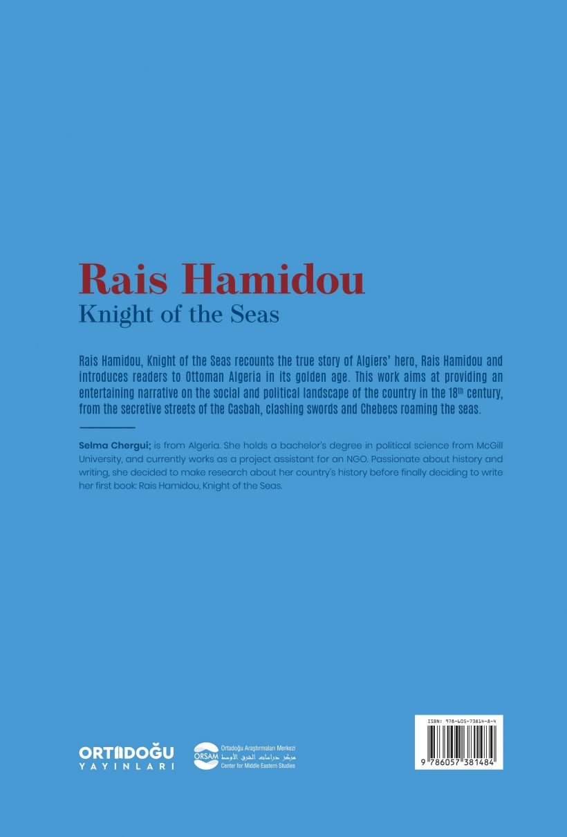 Rais Hamidou, Knight of the Seas recounts the true story of Algiers’ hero, Rais Hamidou and introduces readers to Ottoman Algeria in its golden age. This work aims at providing an entertaining narrative on the social and political landscape of the country in the 18th century, from the secretive streets of the Casbah, clashing swords and Chebecs roaming the seas.